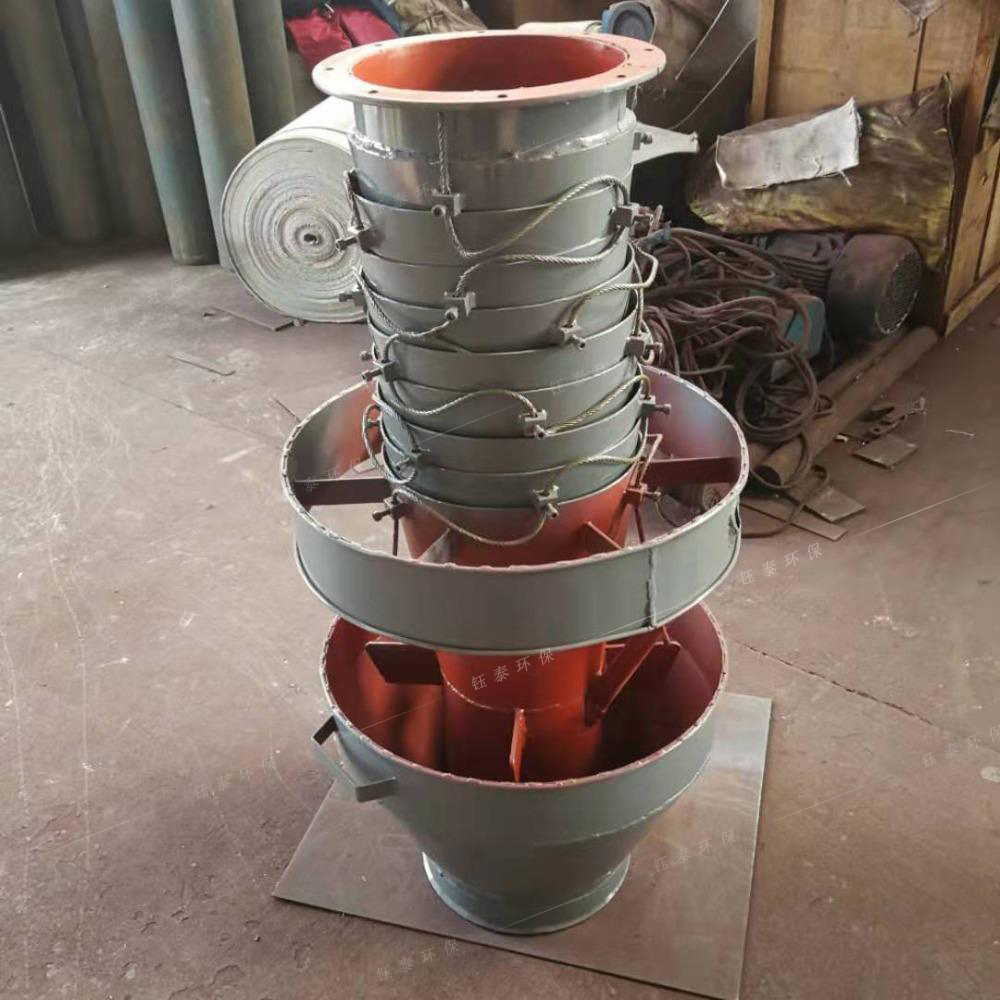 制作外伸縮布袋方式:要求伸縮布袋上每2個(gè)相鄰漲圈之間的垂直間距必須≤10cm,見圖1。當(dāng)外伸縮布袋折疊后2個(gè)相鄰漲圈之間的布袋向內(nèi)褶皺時(shí),不能阻擋住與內(nèi)直鋼套筒外壁之間形成的環(huán)形負(fù)壓吸塵通道的橫截面,從而降低負(fù)壓吸塵的通過量??蛻羰褂矛F(xiàn)場反饋漲圈間距大的吸塵氣流明顯比漲圈間距小的吸塵氣流更加順暢。