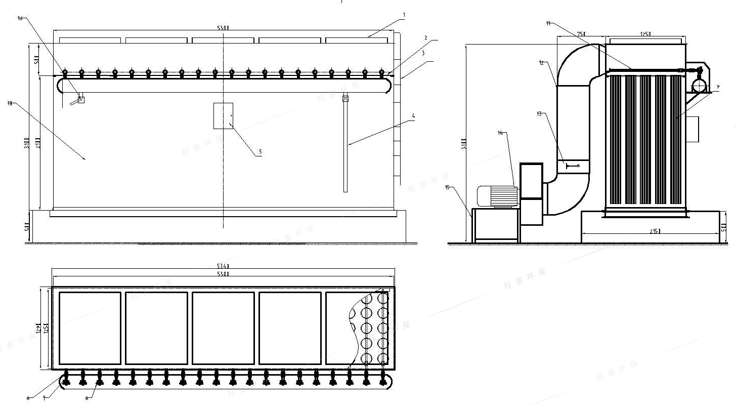 改造后,灰?guī)斓拿繂闻_(tái)庫(kù)頂布袋除塵器技術(shù)參數(shù):處理風(fēng)量17000m3/h、過(guò)濾風(fēng)速1.0m/min、過(guò)濾面積240m2,濾袋耐溫135℃、抽塵風(fēng)機(jī)出口含塵濃度≤10mg/Nm3。除塵器外型尺寸為原除塵器外殼尺寸:5.3×1.25×3.1m(高)